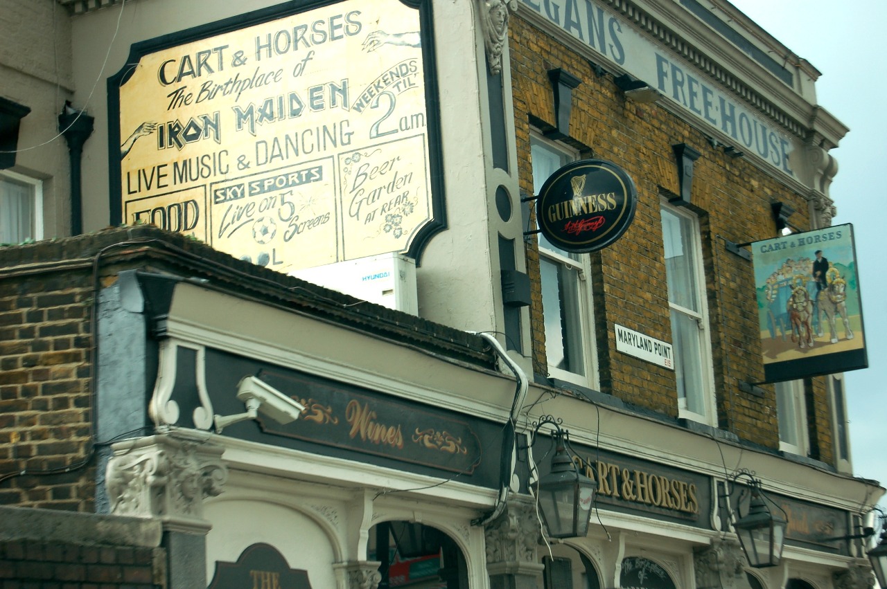 Fachada do Cart and Horses Pub em Stratford, Londres. Nesse local o Iron Maiden fez algumas de suas primeiras apresentações.
